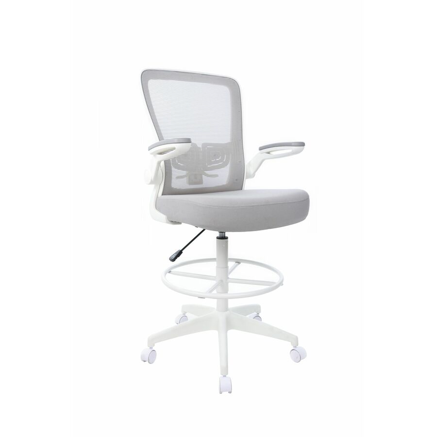 This ergonomically designed stool prioritizes comfort and convenience. Its backrest is crafted with a horizontal mesh, upholstered in linear gray mesh for breathability. The seat is foam-padded and covered in soft touch gray fabric for added comfort. The chair incorporates a spring tilt mechanism, featuring a pneumatic gas lift for effortless height adjustment and an upright locking position. Users can customize the tilt tension using the knob to achieve their preferred setting. The 25" nylon base moves on hooded double-wheel casters so you can move and shift direction with ease. The chair is equipped with flip-up arms for easy maneuverability, a 20" metal foot ring and it can support individuals up to 275 lb.