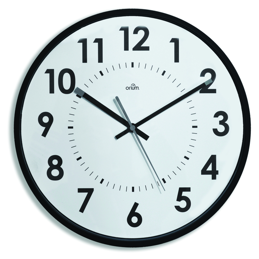Analogic clock featuring ABS anti-shock case with protective mineral glass face cover, quartz sweep movement, contrasting lined minute and hour markings, 30m readability with 2.8 cm black numbers on white background 12" diameter. Uses one "AA" battery (included). 3-year warranty. Black/White.