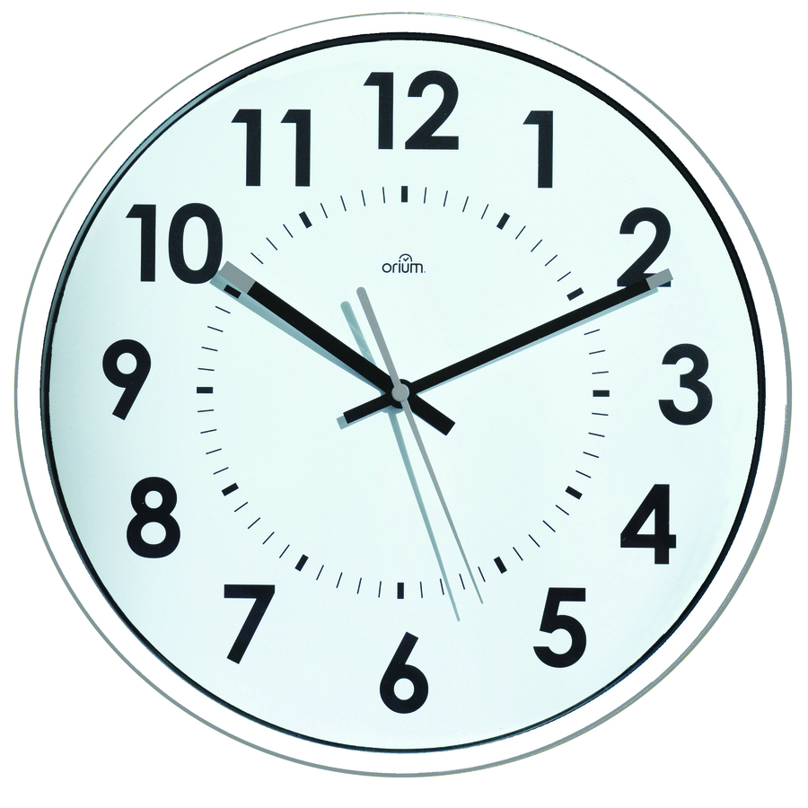 Analogic clock featuring ABS anti-shock case with protective mineral glass face cover, quartz sweep movement, contrasting lined minute and hour markings, 30m readability with 2.8 cm black numbers on white background 12" diameter. Uses one "AA" battery (included). 3-year warranty. White.