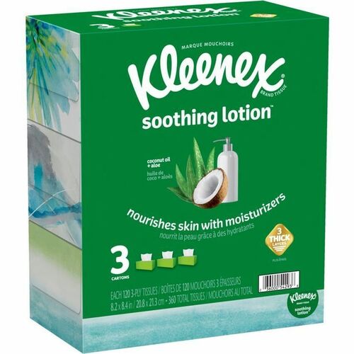Infused with a touch of coconut oil, aloe and vitamin E, nourishes and protects skin by locking in moisture Flat box. 3-ply. 120 sheets per box. White. 3 boxes/pkg.