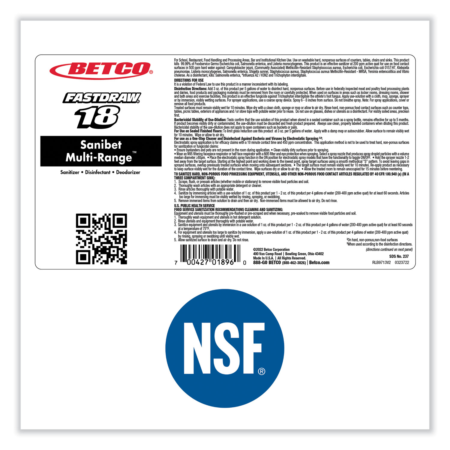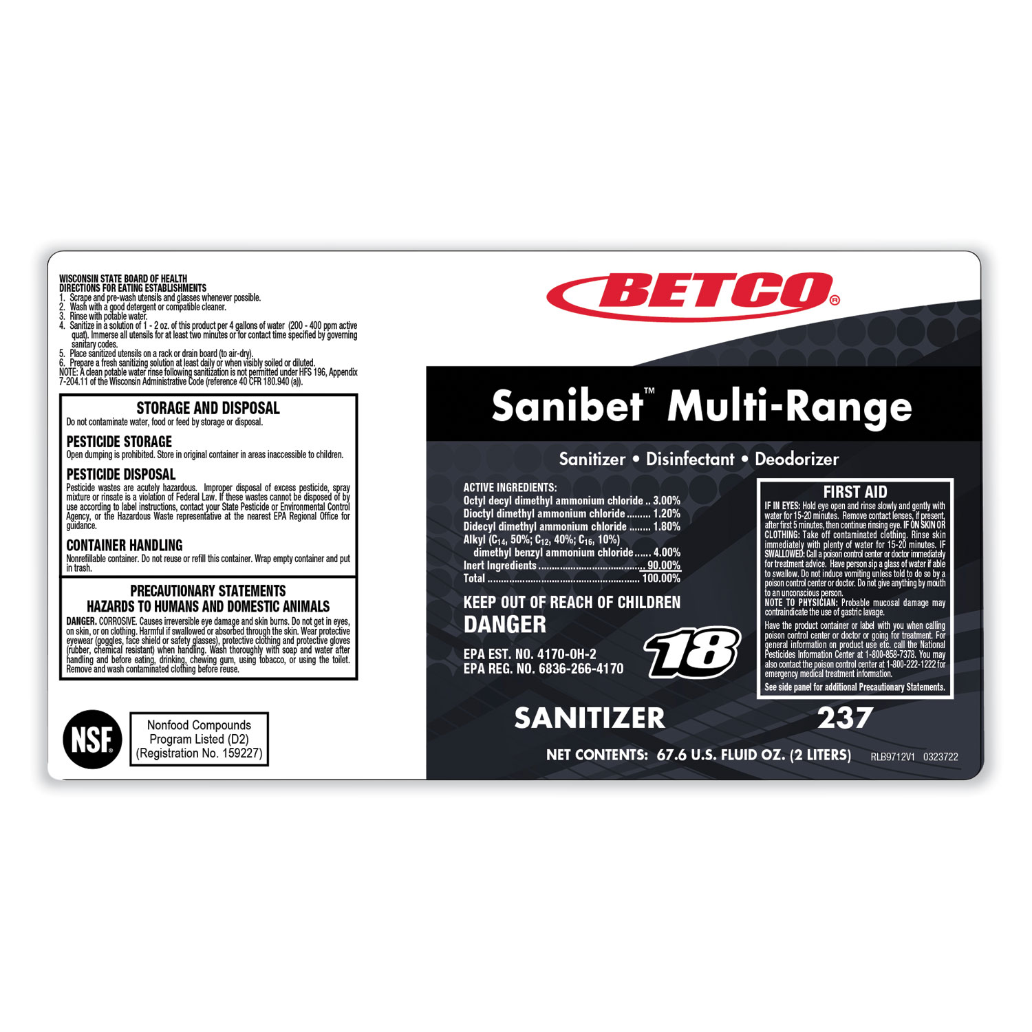 This EPA-approved broad range sanitizer delivers correct sanitizing at a range of 150 to 400 ppm, allowing the sanitizing solution to adapt to varying water pressure situations while maintaining compliance with health department regulations. Multi-Range Sanibet™ kills 99.99% of food service organisms such as Listeria, E-Coli and Salmonella. A versatile product, it can be used to sanitize serving ware, utensils, pots and pans and food processing equipment. It can also be used for disinfecting floors and walls. It is a complete, chemically balanced disinfectant, sanitizer that is effective even in the presence of hard water. Highly concentrated, this product provides a low end use cost per gallon. Multi-Range Sanibet™ has a red color indicator which provides visual confirmation of use. One bottle yields 17 gal. Works with all FastDraw dispensing options.
