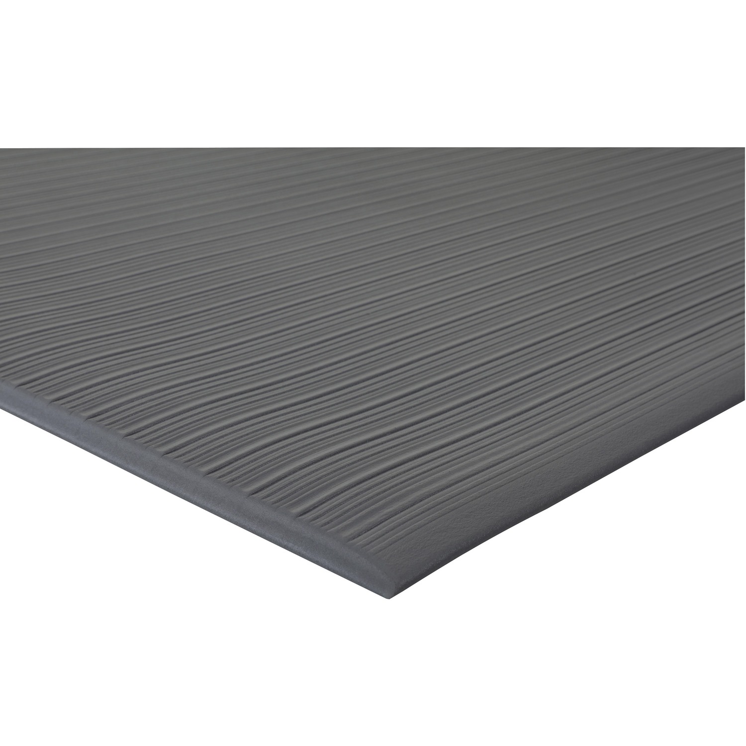 Anti-fatigue mat offers 3/8" thick, vinyl foam structure to provide support that reduces fatigue and discomfort. Ribbed surface increases safety. Beveled edge allows easy wheel movement on and off the mat. Mat is designed for indoor use in warehouses, factories and more.
