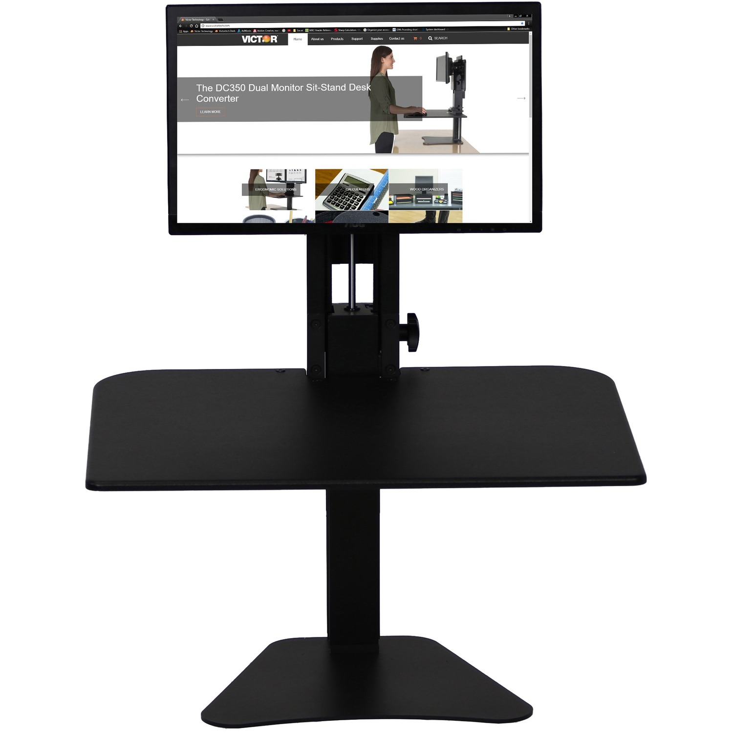 High Rise Sit-Stand Desk Converter is a simple solution to a common workplace problem: too much sitting. Studies show that sitting for prolonged periods of time is detrimental to your health. Using this converter to stand while you're working reduces or eliminates the pain you experience from being hunched over your desks and the negative long-term effects of sitting for long hours. It transforms any sit-down desk into a sit or stand-up desk. The 28" wide x 23" deep surface is raised up to 15-1/2" for ergonomic placement of laptop computer, keyboard, mouse or papers while standing. Gas strut design allows easy custom height adjustment of both desk and monitor with the loosening of a knob. Monitor holder is also height-adjustable. For a break from standing, simply push the surface down to desktop level. Sleek wood construction and a durable laminate coating provide years of use. The rear portion of the desk is tapered to fit corner cubicles. Heavy steel base prevents tipping.