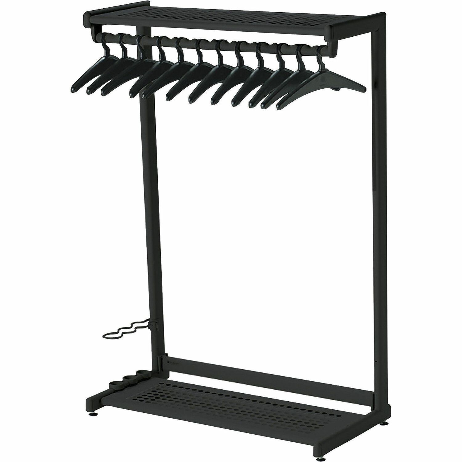 Contemporary, radius-designed garment rack moves where you need welcome guests and store their coats and accessories. It is made of textured steel with powder-coat finish. Each includes hangers and features bottom shelf for footwear and attachable rack for umbrellas. Custom-molded hanger rail is evenly indexed to accommodate four to eight hangers per foot. Freestanding garment rack is 61-1/2" high, including levelers.