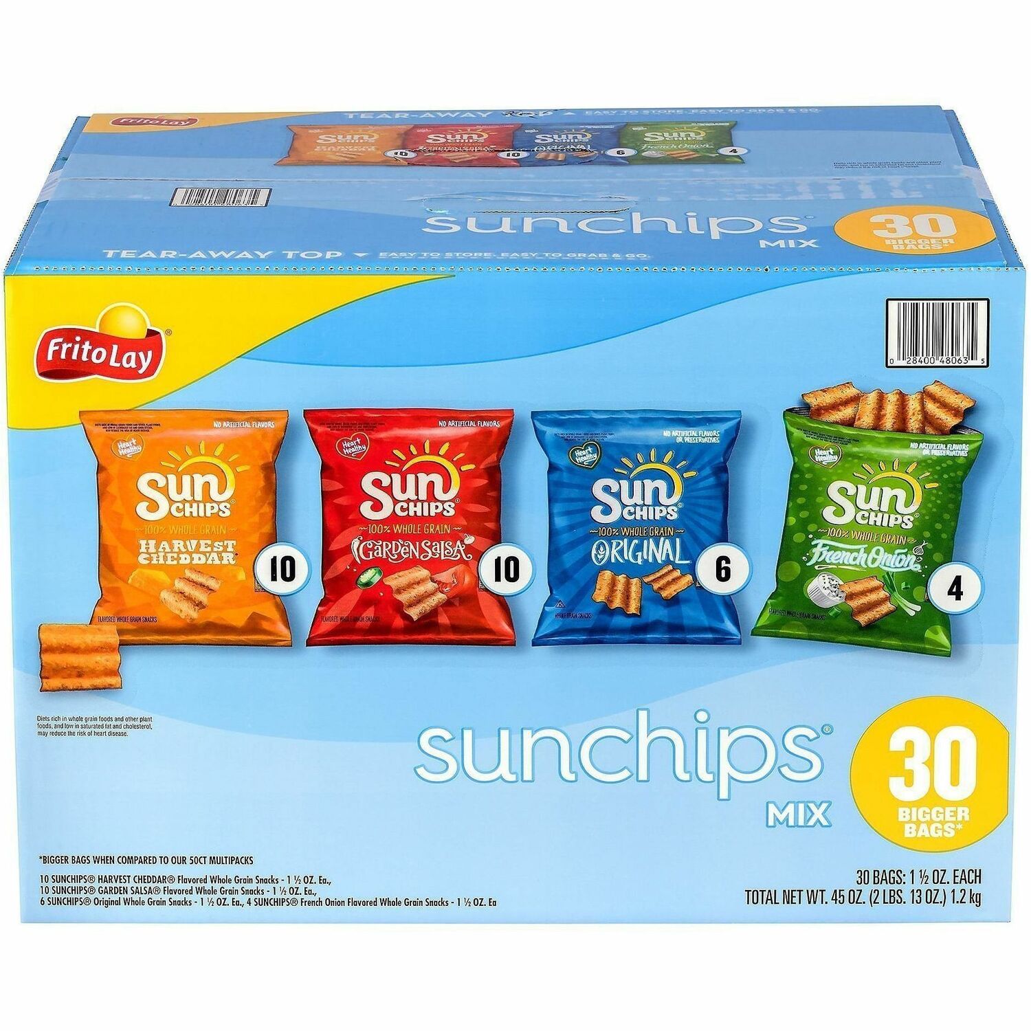 Looking for a crisp, flavorful snack with variety? This 30-count Sunchips Mix Box has you covered with Harvest Cheddar, Original and French Onion. Perfect for the employee breakroom, stocking the pantry or packing with lunch, this mix offers a tasty change of pace from regular chips.