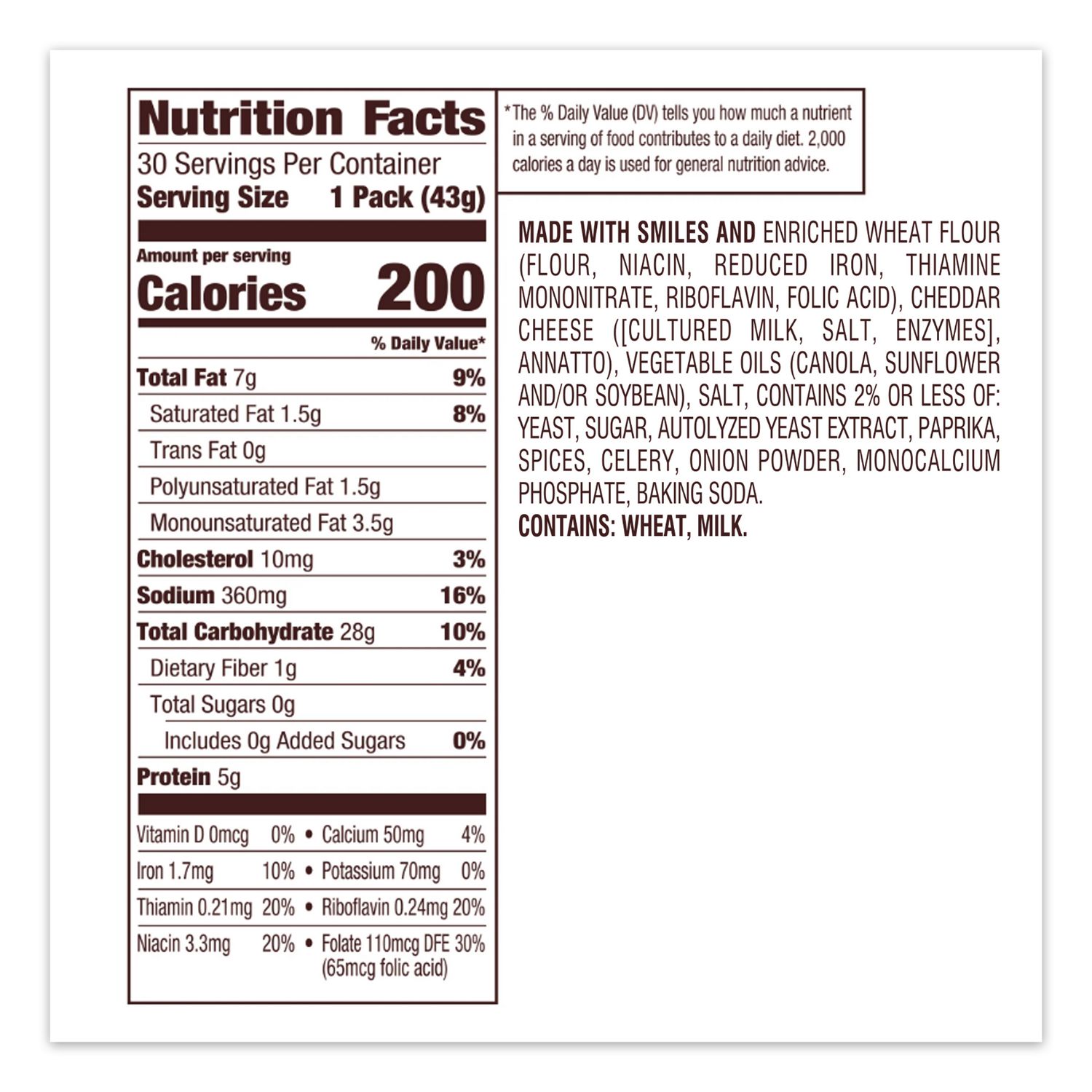 Swim through your afternoon with tasty baked snack crackers in your favorite fishy shapes. Baked crackers have zero grams trans fat. Yummy cheddar cheese flavor. Let these little fishies brighten up your day; they're the only snack that smiles back!